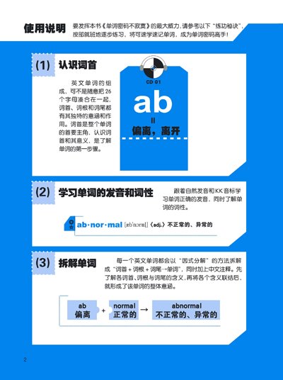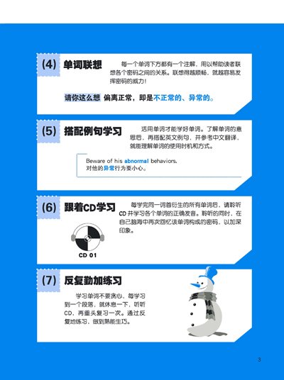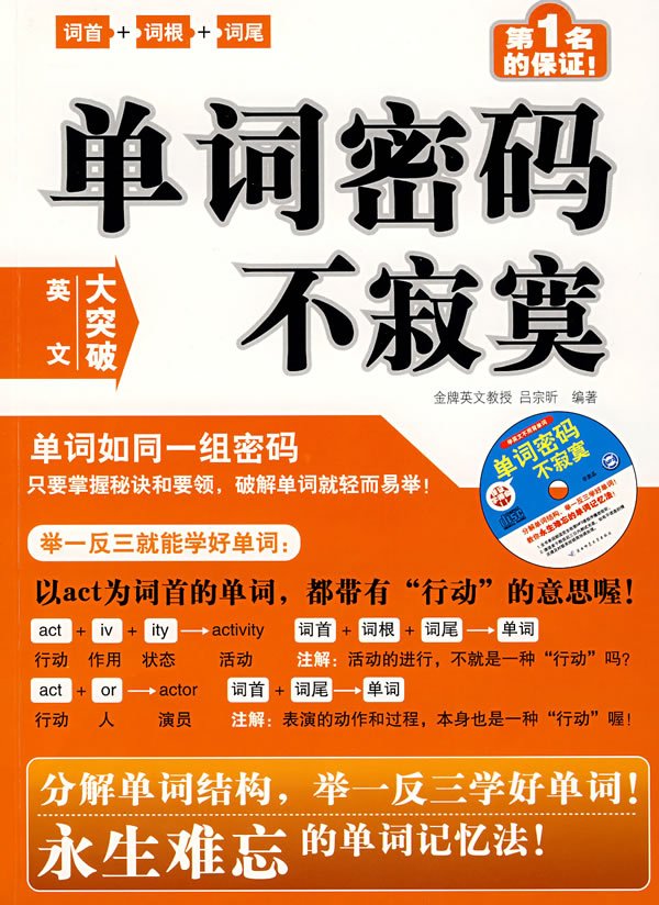 如果你想达成以上任何一件事情,你应该参考本书——《单词密码不寂寞》。这本《单词密码不寂寞》与一般坊间的单词书有相当大的区别,它的特色在于:将相同的“密码”归纳汇整,同时统一“密码”中的中文含义,避免造成学习者混淆。利用“分解因式”的方法,将单词拆解成不同的“密码”,以“词首+词根+词尾=单词”的结构,让读者更易记忆。每个单词后,附上英文例句,并加上中文翻译,帮助读者学习造句。随书附赠MP3格式的光盘,协助读者学习正确发音,并由发音练习进一步熟悉单词。