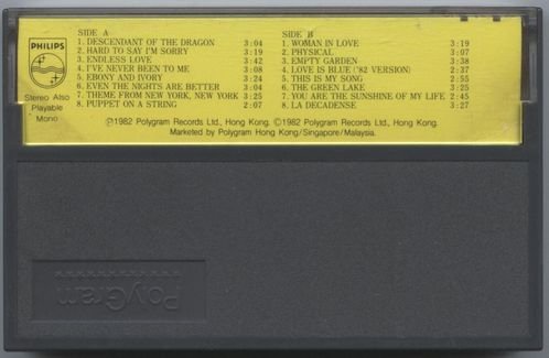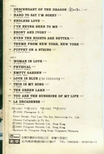 : 01. Descendant Of The Dragon 02. Hard To Say I'm Sorry 03. Endless Love 04. I've Never Been To Me 05. Ebony And Ivory 06. Even The Nights Are Better 07. Theme From New York, New York 08. Puppet On A String 09. Woman In Love 10. Physical 11. Empty Garden 12. Love Is Blue ('82 version) 13. This Is My Song 14. The Green Lake 15. You Are The Sunshine Of My Life 16. La Decadense