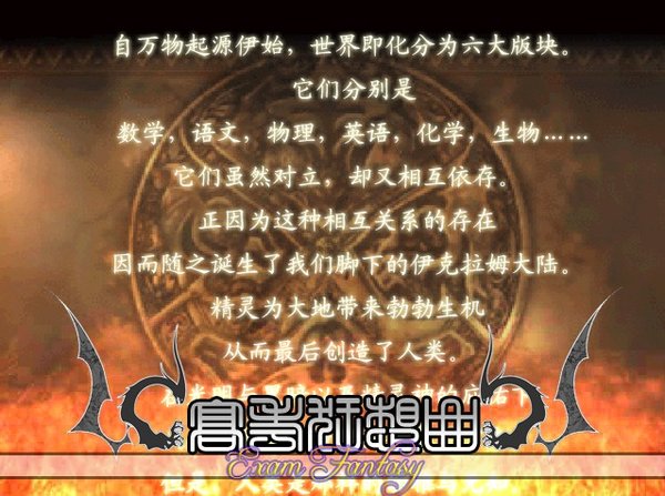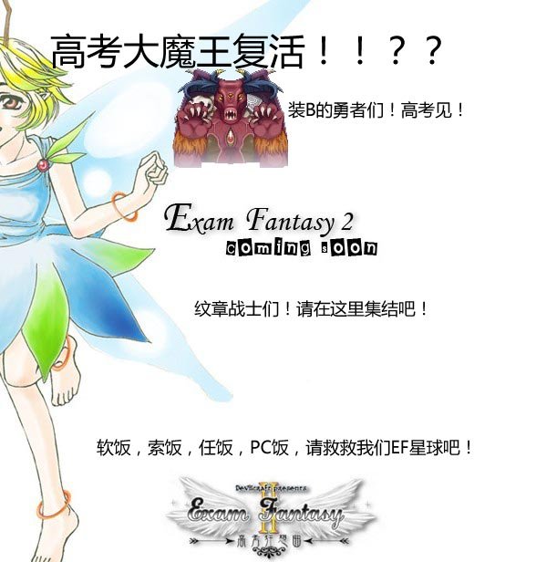 火炎之文章~高考之圣火(简称EF,囧版FE)是一部暴笑的战略型角色扮演游戏,让大家感受到脱离现实又与现实息息相关的特殊气氛,在这里最重要的不是想着如何解救世界,而是如何游戏人生!这里是高考狂想曲的世界。这里充满了妄想,奇想,幻想,以及叫人惊奇,不可思议的事物。隐居森林的数学之村,在街上散步的宠物老虎,生物王国HIV事件,化学之都的大暴炸以及充满怨念的NPC阿尔西斯……世界分为几个版块,分别代表着几种不同的势力,数学之森,生物王国,英语帝国,化学之都以及神秘的语文天国.西历776年,ACE女王继承王位,成为英语王国的第34代女王,她发起了争服世界的战争,战争的真正原因是她饥渴的占有欲吗?!据调查好象是因为她找到了一本名为《RPG MAKER XP说明》的天书……
