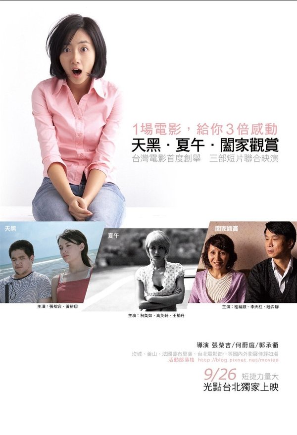 其中《天黑》、《夏午》与《阖家观赏》这三部短片,类型、主题、形式各有差异,皆为成绩斐然、口碑杰出的作品,虽然都只是短片,但从影像形式到叙事内容都甚具话题性,卡司阵容亦皆为一时之选,包括桂纶镁、陆弈静、李天柱、张榕容、柯奂如、高英轩等知名演员。如今这三部作品将组成《天黑.夏午.阖家观赏》,从9月26日起于光点台北正式上映,提供电影观众与众不同、前所未有、兼具话题与创意的电影经验,希望让这1场电影,带给大家3倍的感动。