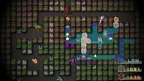 所谓的“堀”,就是挖掘刀,是用来表示“可以用十字镐挖掘土壤几次”的数字,也会在过关之后让怪物升级时用到。所谓“军”,是综合迷宫里面所有怪物战力予以数值化的结果。只要增加从高养分土壤诞生的强劲怪物数量,该数值就会随之提升。这项数值越高,能够击退勇者斗可能性也就会越高。“苔”类怪物具有“会把某些场所的养分搬到其他场所”的习性,只要利用这点来营造养分的失衡,就能够生产出强悍的怪物。