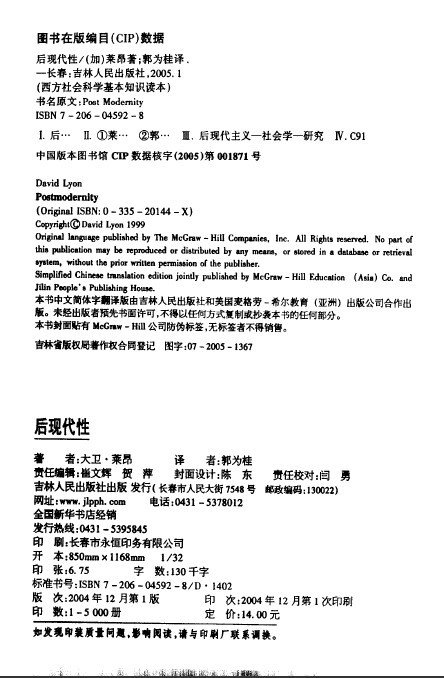 转型期的中国(传统到现代的转型)正处在对现代性的“饥渴”状态之中。那么,后现代性是不是一种奢谈呢?认真阅读莱昂对后现代性的解读,答案昭然若揭:谁能否认,新技术、消费主义等这些“后现代状况”不是活生生地在我们身边展示?在全球化和信息化时代背景之下,后现代性虽然并非中国的“主流”,谁又能否认,这股“支流”能够反照“主流”、能够让我们更清醒地评估现代化事业?还有,在我看来,眼下风行的“读经运动”,正是国人自信力提升、因而不殚从传统中挖掘出救助当下精神危机良方的表现。我们正在共时性地体验着传统、现代、后现代,因此,我们难道不是更有理由“认可后现代,重估现代,回收利用前现代”吗? 当然,需要指出的是,莱昂作为西方学者,对于一些问题的看法保持着自己的视角,在作品中,他几次谈及后现代和马克思主义的关联,并把马克思对于资本主义的批评作为后现代性的特征来讨论,这显然是牵强的,是作者对马克思主义缺乏深刻的认识所致。在另一个方面,作者对于现代性的批评,也显得过于严厉。虽然这些缺点不能稍减这部作品的价值,但是,我们在阅读过程,还是要持有一种批评的态度,合理地进行取舍。