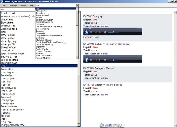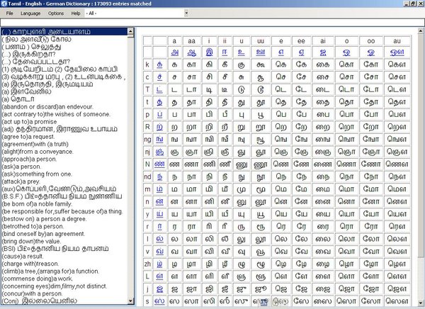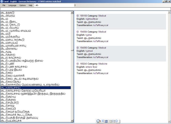 3. 可以选择查询语言,从英语、泰米尔语和德语开始查询词条。