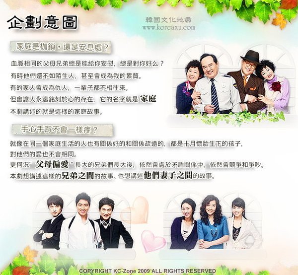 】:叙述家族内三兄弟及其妻子之间的故事。因为父母的偏爱而长大的三兄弟充满了对亲情的矛盾和价值观的扭曲,经过了许多事件终於了解到手足亲情是无法用任何标準来衡量的。其中有辛酸有詼谐有温馨,是一部发生在你我身边的《家》的故事。