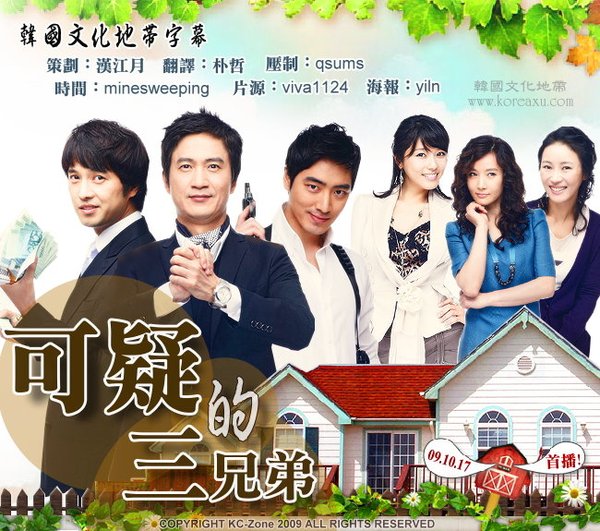 【中文剧名】:可疑的三兄弟 【韩文剧名】:수상한 삼형제 【电视台】:KBS2 周末剧 【首 播】:2009年10月17日晚间7点55分(韩国时间)6点55分(北京时间) 【回 数】:50集(暂定) 【导 演】:진형욱 陈亨旭 【编 剧】:문영남 文英楠 【演 员】:安内相 吴大奎 李俊赫 陶智媛 金熙贞 吴智恩 【格 式】:RMVB 【语 言】:朝鲜语 【字 幕】:简体中文 【制作出品】:韩国文化地带 【