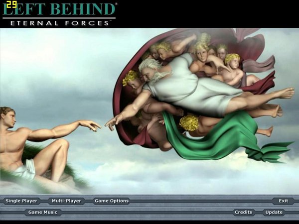 除非你生活在背向月球的黑暗一带超过十年,否则你不会对这种隐晦、紧张、压抑的的“世界末日”的景象感到熟悉。这就是以基督教为主题的末世科幻小说《Left Behind》系列给读者代来的感觉。不管你把《Left Behind》作为规范道德的小说还是令人毛骨悚然的恐怖故事,《Left Behind》系列在全球发行量超过6300万已经成为事实,也曾被好莱坞倾巨资拍成电影,甚至还有唱片公司为之制造专门的音乐光碟,其影响力足以与风靡全球的《哈里波特》比美。乘着小说的风潮,Left Behind Games就以此部小说为蓝本而改编了游戏《Left Behind: Eternal Forces》,游戏类型为RTS,与《王国的兴起》(Rise of Nations)、《魔兽争霸3》(Warcraft III)相仿。