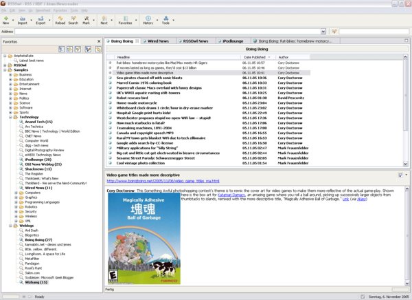 RSSOwl is a RSS / RDF / Atom Newsreader written in Java using SWT as fast graphic library. Read News in a tabfolder, save favorites in categories, Export to PDF / RTF / HTML / OPML, Import Feeds from OPML, perform fulltext-search, use internal browser.