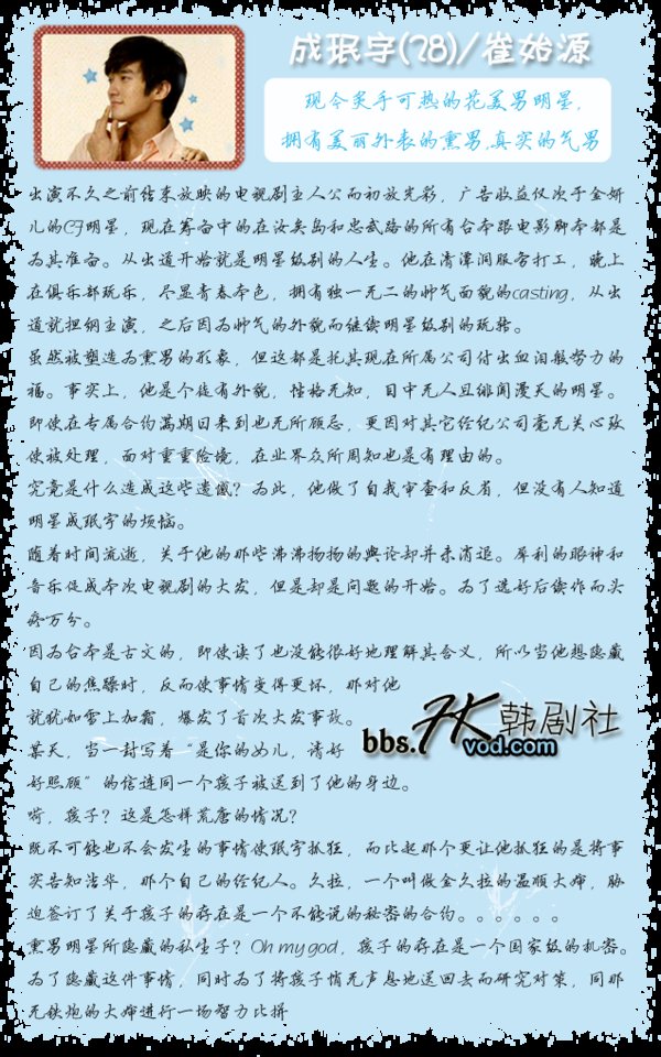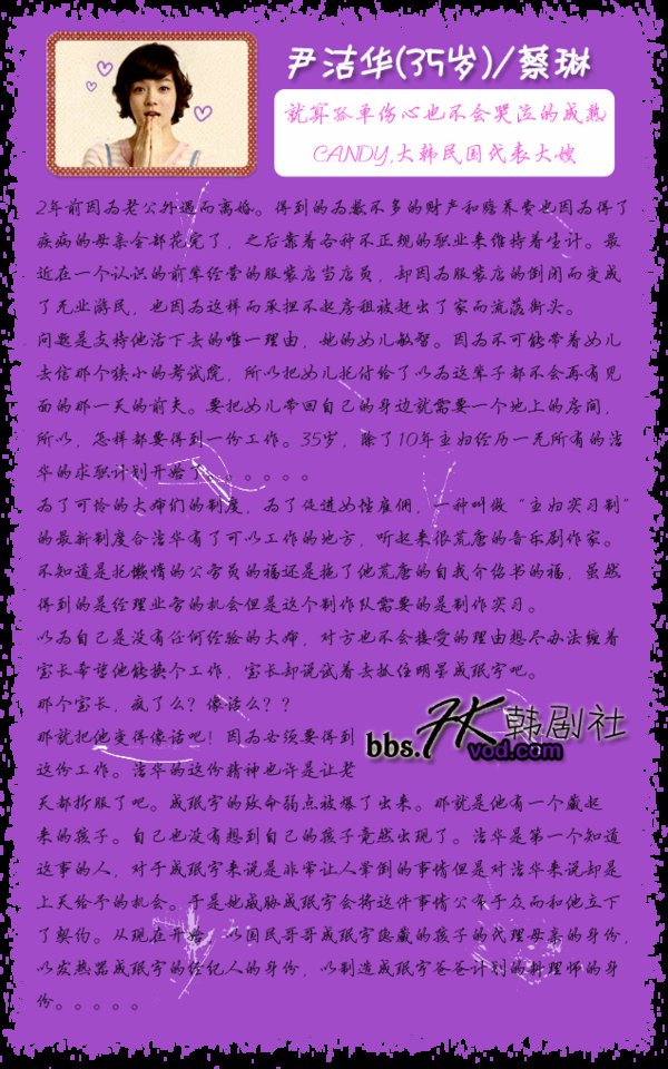 】蔡琳饰演一个35岁没钱,为了把孩子从没房子的老公那里领回来而担任了花美男TOP明星的经纪人.很多孤独悲伤但是绝不放弃的蔡琳,最终成功的把孩子领回来,并且和与自己年纪小的男子成就了爱情。男主人公成民宇一角(崔时源)是个很红的花美男演员的挑剔男,有一天突然出现个陌生的6岁小孩,多亏这孩子他的人生刷啦的起了变化,并且意外的和(晴华)展开了同居生活。 【共享时间】:23:00至第二天19:00 节假日全天 企划意图: