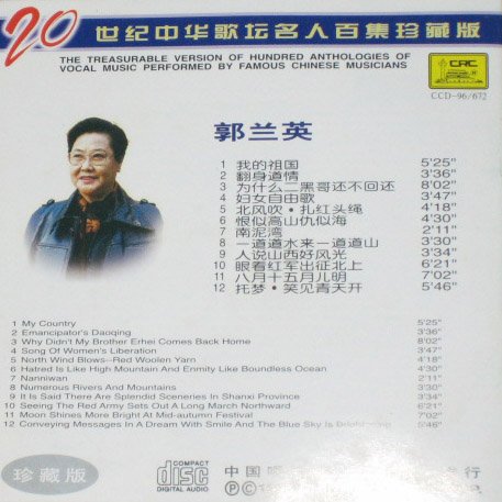 郭兰英是一位为亿万人民所热爱并引以自豪的著名歌唱家,几乎半个世纪过去了,在中国歌坛上,她依然代表着民族声乐艺术的最高成就。1948年首次演出歌剧《白毛女》获得成功。其后,她在中国民族歌剧舞台上,她塑造了众多光彩夺目的艺术形象。她实践丰富,从声乐、表演台词以及继承和创新,为中国新歌剧艺术完整体系的建立,做出了历史性的贡献。这张专辑收录的《我的祖国》、《南泥湾》、《人说山西好风光》、《北风吹、扎红头绳》等许多脍炙人口的歌曲,曾风磨五、六十年代。她曾获首届“金唱片奖”。在中国歌坛上,她代表着民族声乐艺术的最高成就。 郭兰英嗓音甜美,音域宽阔,吐字清晰,行腔富于韵味,具有浓郁的中国民族歌唱特色。由于她少年时受过戏曲演员的严格训练,艺术功底很深,她的演唱兼蓄神、情、形、声、腔、字六艺之美。她所扮演的人物,达到了歌唱与表演的高度和谐统一,为中国新歌剧表演体系的建立作出了开拓性的贡献。她演唱的歌曲《南泥湾》、《翻身道情》、《绣金匾》、《妇女自由歌》以及电影《上甘岭》插曲《我的祖国》、歌剧《刘胡兰》中的《一道道水来一道道山》等都具有浓郁的民族风格和鲜明的地方特色,在全国流传很广,已成为我国民族歌曲中的经典之作。 1930年出生于山西平遥县香乐村一个贫苦的农民家庭。她从小就酷爱本乡本土的戏曲——山西梆子(晋剧),五岁开始学唱,十二岁在太原开化寺戏园初次登台,一举成名,十四岁在张家口挂头牌演出,享誉塞外剧坛。1946年参加华北联大文工团。1947年入华北联合大学戏剧系边学习边参加演出。1948年8月转入华北大学文工一团。曾演出《王大娘赶集》、《夫妻识字》、《兄妹开荒》等歌舞剧。1949年4月,她随中国青年代表团参加了在匈牙利举行的第2届世界青年学生和平与友谊联欢节,以演唱《妇女自由歌》获奖。 1949年以《妇女自由歌》灌制了第一张唱片。建国后,她先后在中央戏剧学院、中央实验歌剧院和中国歌剧舞剧院工作,担任文联第四届全国委员,中国音协第二、三届理事。她于1982年告别舞台,到中国音乐学院任教。1986年在广东番禺创办郭兰英艺术学校,任校长。1989年荣获首届金唱片奖。 新中国成立后,她先后在中央戏剧学院附属歌舞剧院、中央实验歌剧院、中国歌剧舞剧院任主要演员,主演了新歌剧《白毛女》、《刘胡兰》、《春雷》、《红霞》、《小二黑结婚》、《窦娥冤》等。作为中国艺术的使者,她曾访问了苏联、罗马尼亚、波兰、捷克斯洛伐克、南斯拉夫、意大利、日本等20个国家,为中外文化交流作出了贡献。