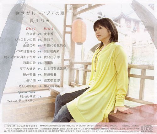 压箱底的拿出来继续发 希望大家能支持我!! 夏川里美的 "歌さがし" 系列第2弹,用日文与中文分别翻唱了10首经典歌谣,受到了邓丽君的影响 感觉也有点像她的 中文版的听起来很有意思哦 虽然不是非常标准 但是不错啦 总之我推荐大家来听听这张专辑 因为有中文歌曲么 嘿嘿(夏川大妈不会是要进军国语乐坛吧- -!) 夏川りみ / 歌さがし~アジアの风~ 规格品番VICL-63541~2 组み枚数]:[2枚]価格:\3,990(税込) 発売日:2010/02/24 新作は2枚组のカバーアルバム。CDー1収録曲:时の流れに身をまかせ/别れの予感(テレサテン)、长い间(Kiroro)、さくら(独唱)(森山直太朗)、四季の歌、夜来香、苏州夜曲 他全11曲予定。CDー2にはCDー1収録曲を北京语カバーバージョンで収録。