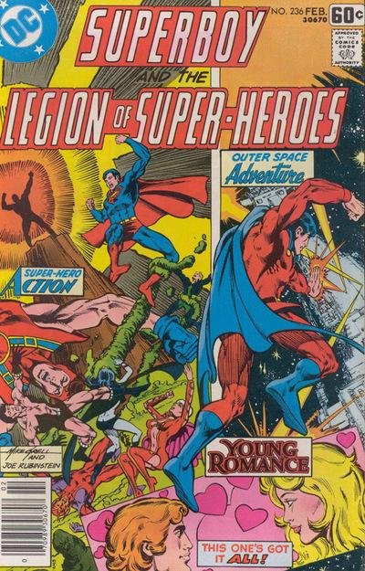 ---------------------------------------------------------------------------------- 【作品详细介绍】 #222-313 全 (直道222卷漫画改名之前,此漫画名称为Superboy, 超男漫画) 1977-1984 这一点依然忽视解说会使读者感得情节赜淆。 大量观众所知的超人描绘限于电影,或隘段漫画里。超人虽然仪表不凡, 是人类之间尽善尽美的楷模,但除了这些之外,多人了解超人的神话还不是很熟稔。 超人在青春时代里,换言之,就是在小镇Smallville上高中时期,他还只是普通简陋的Clark Kent,正在认识自己的过程中,寻风觅影。自己带有神圣的力量,但还无视事实。 数年后,Clark在大都市Metropolis找到了适合记者岗位,才开始担任超级英雄的身份。 这里出现的问题就是。。。。 那么Superoby超男到底是谁? 超男名字也是Clark Kent, 但他在高中时期早就在芸芸众生里有自己的隐生超级英雄经验。这位少年超人大放厥词,口若悬河,在世上绝无忌惮。超级英雄军团从未来回到20世纪时线否则发现他与另外那位大名绅士有所不同,难道时乖运舛。。。 从这里我们理解。。。。超人与超男不是同一人。。。 纵然,超男照样是超级英雄军团里喜爱的元勋之一,与这些31世纪的强汉打成一片,作者Paul Levitz将把超男写进了故事里,进一步添加了一位新壮士使了漫画变得更强大。 至从#258卷开始,超男又离开了军团,漫画再次改名成 “超级英雄军团漫画” 【封面】