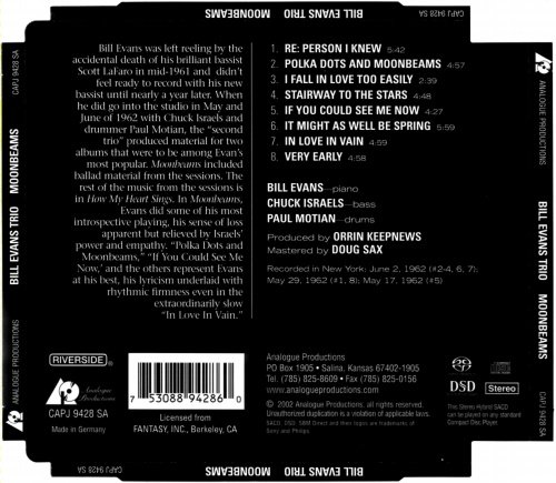 As if to make up for lost time, the newly reconstituted trio recorded two albums' worth of material in June and May of 1962. MOONBEAMS is the "softer" of the two and introduced two graceful Evan's originals, "Re: Person I Knew" (an anagram of producer Orrin Keepnews's name) and the lyrical fugue "Very Early." While any of the early Riverside albums make an excellent introduction to Bill Evans, MOONBEAMS is perhaps the most exquisitely romantic of the bunch, much like Coltrane's BALLADS in this respect. ~By Cduniverse.com