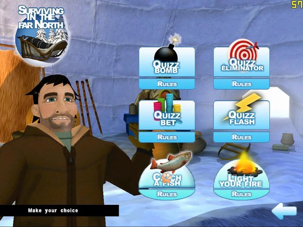 【游戏简介】 游戏将引导你到北方去旅行,这里你会遇到各种困难,满足你的挑战和冒险欲望。游戏中有4个主题旅游地,在这里你能学习到各种生存知识,并且学会热爱你脚下的这颗行星。 游戏中你可以创建自己的资料,选择人物性格,并且通过回答问题、建立冰屋以获得冻鱼、皮艇等生存必需品。游戏中还包含6个迷你游戏,丰富你的冒险生活。游戏最多支持4人,你可以与朋友、家人一起享受竞争和合作的快乐。本作改编自同名电影,游戏的意义在于通过问答让你了解和欣赏我们美丽的地球家园。 【游戏截图】