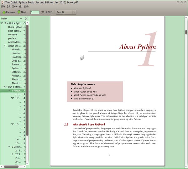 : contents preface xvii acknowledgments xviii about this book xx PART 1 STARTING OUT ................................................. 1 1 About Python 3 1.1 Why should I use Python? 3 1.2 What Python does well 4 Python is easy to use 4 Python is expressive 4 ■ Python is readable 5 Python is complete—“batteries ■ included” 6 Python is cross-platform 6 Python is free 6 ■ ■ 1.3 What Python doesn’t do as well 7 Python is not the fastest language 7 Python doesn’t have the ■ most libraries 8 Python doesn’t check variable types at ■ compile time 8 1.4 Why learn Python 3? 8 1.5 Summary 9 vii viii CONTENTS 2 Getting started 10 2.1 Installing Python 10 2.2 IDLE and the basic interactive mode 12 The basic interactive mode 12 The IDLE integrated development ■ environment 13 Choosing between basic interactive mode and ■ IDLE 14 2.3 Using IDLE’s Python Shell window 14 2.4 Hello, world 15 2.5 Using the interactive prompt to explore Python 15 2.6 Summary 17 3 The Quick Python overview 18 3.1 Python synopsis 19 3.2 Built-in data types 19 Numbers 19 Lists 21 Tuples 22 Strings 23 ■ ■ ■ Dictionaries 24 Sets 24 File objects 25 ■ ■ 3.3 Control flow structures 25 Boolean values and expressions 25 The if-elif-else ■ statement 26 The while loop 26 The for ■ ■ loop 27 Function definition 27 Exceptions 28 ■ ■ 3.4 Module creation 29 3.5 Object-oriented programming 30 3.6 Summary 31 PART 2 THE ESSENTIALS ............................................. 33 4 The absolute basics 35 4.1 Indentation and block structuring 35 4.2 Differentiating comments 37 4.3 Variables and assignments 37 4.4 Expressions 38 4.5 Strings 39 4.6 Numbers 40 Built-in numeric functions 41 Advanced numeric ■ functions 41 Numeric computation 41 Complex ■ ■ numbers 41 Advanced complex-number functions 42 ■ 4.7 The None value 43 ix CONTENTS 4.8 Getting input from the user 43 4.9 Built-in operators 43 4.10 Basic Python style 43 4.11 Summary 44 5 Lists, tuples, and sets 45 5.1 Lists are like arrays 46 5.2 List indices 46 5.3 Modifying lists 48 5.4 Sorting lists 50 Custom sorting 51 The sorted() function 52 ■ 5.5 Other common list operations 52 List membership with the in operator 52 List concatenation ■ with the + operator 53 List initialization with the * ■ operator 53 List minimum or maximum with min and ■ max 53 List search with index 53 List matches with ■ ■ count 54 Summary of list operations 54 ■ 5.6 Nested lists and deep copies 55 5.7 Tuples 57 Tuple basics 57 One-element tuples need a ■ comma 58 Packing and unpacking tuples 58 ■ Converting between lists and tuples 60 5.8 Sets 60 Set operations 60 Frozensets 61 ■ 5.9 Summary 62 6 Strings 63 6.1 Strings as sequences of characters 63 6.2 Basic string operations 64 6.3 Special characters and escape sequences 64 Basic escape sequences 65 Numeric (octal and hexadecimal) and ■ Unicode escape sequences 65 Printing vs. evaluating strings ■ with special characters 66 6.4 String methods 67 The split and join string methods 67 Converting strings to ■ numbers 68 Getting rid of extra whitespace 69 String ■ ■ searching 70 Modifying strings 71 Modifying strings with ■ ■ list manipulations 73 Useful methods and constants 73 ■ x CONTENTS 6.5 Converting from objects to strings 74 6.6 Using the format method 76 The format method and positional parameters 76 The format ■ method and named parameters 76 Format specifiers 77 ■ 6.7 Formatting strings with % 77 Using formatting sequences 78 Named parameters and ■ formatting sequences 78 6.8 Bytes 80 6.9 Summary 80 7 Dictionaries 81 7.1 What is a dictionary? 82 Why dictionaries are called dictionaries 83 7.2 Other dictionary operations 83 7.3 Word counting 86 7.4 What can be used as a key? 86 7.5 Sparse matrices 88 7.6 Dictionaries as caches 88 7.7 Efficiency of dictionaries 89 7.8 Summary 89 8 Control flow 90 8.1 The while loop 90 The break and continue statements 91 8.2 The if-elif-else statement 91 8.3 The for loop 92 The range function 93 Using break and continue in for ■ loops 94 The for loop and tuple unpacking 94 The ■ ■ enumerate function 94 The zip function 95 ■ 8.4 List and dictionary comprehensions 95 8.5 Statements, blocks, and indentation 96 8.6 Boolean values and expressions 99 Most Python objects can be used as Booleans 99 Comparison and ■ Boolean operators 100 8.7 Writing a simple program to analyze a text file 101 8.8 Summary 102 xi CONTENTS 9 Functions 103 9.1 Basic function definitions 103 9.2 Function parameter options 105 Positional parameters 105 Passing arguments by parameter ■ name 106 Variable numbers of arguments 107 Mixing ■ ■ argument-passing techniques 108 9.3 Mutable objects as arguments 108 9.4 Local, nonlocal, and global variables 109 9.5 Assigning functions to variables 111 9.6 lambda expressions 111 9.7 Generator functions 112 9.8 Decorators 113 9.9 Summary 114 10 Modules and scoping rules 115 10.1 What is a module? 115 10.2 A first module 116 10.3 The import statement 119 10.4 The module search path 119 Where to place your own modules 120 10.5 Private names in modules 121 10.6 Library and third-party modules 122 10.7 Python scoping rules and namespaces 123 10.8 Summary 128 11 Python programs 129 11.1 Creating a very basic program 130 Starting a script from a command line 130 Command-line ■ arguments 131 Redirecting the input and output of a ■ script 131 The optparse module 132 Using the fileinput ■ ■ module 133 11.2 Making a script directly executable on UNIX 135 11.3 Scripts on Mac OS X 135 11.4 Script execution options in Windows 135 Starting a script as a document or shortcut 136 Starting a script ■ from the Windows Run box 137 Starting a script from a ■ command window 137 Other Windows options 138 ■ xii CONTENTS 11.5 Scripts on Windows vs. scripts on UNIX 138 11.6 Programs and modules 140 11.7 Distributing Python applications 145 distutils 145 py2exe and py2app 145 Creating executable ■ ■ programs wi