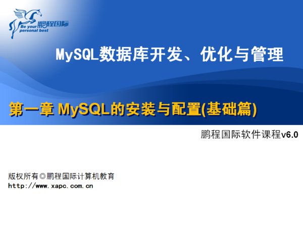 西安鹏程计算机学校MySQL基础、开发、管理维护以及优化系列教程。主讲人-小海老师-本教程从开发、优化和管理维护3个角度逐步深入,融合了小海老师多年工作实践的积累和经验。不但总结了应用MySQL数据库时遇到的各种问题及其解决方案。适合于开发人员和数据库管理人员学习,参考。