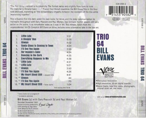 This is Evans's first trio date under his own name for Verve, and the deep communication he maintains throughout with Gary Peacock and Paul Motian, two brilliant rhythm players still very active on the scene, is as remarkable today as it was in '64. This release, taken from the unprecedented 18-CD "Complete Bill Evans on Verve," includes every alternative take in the box set.