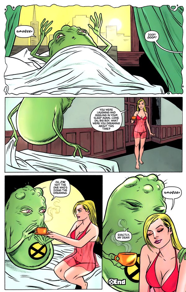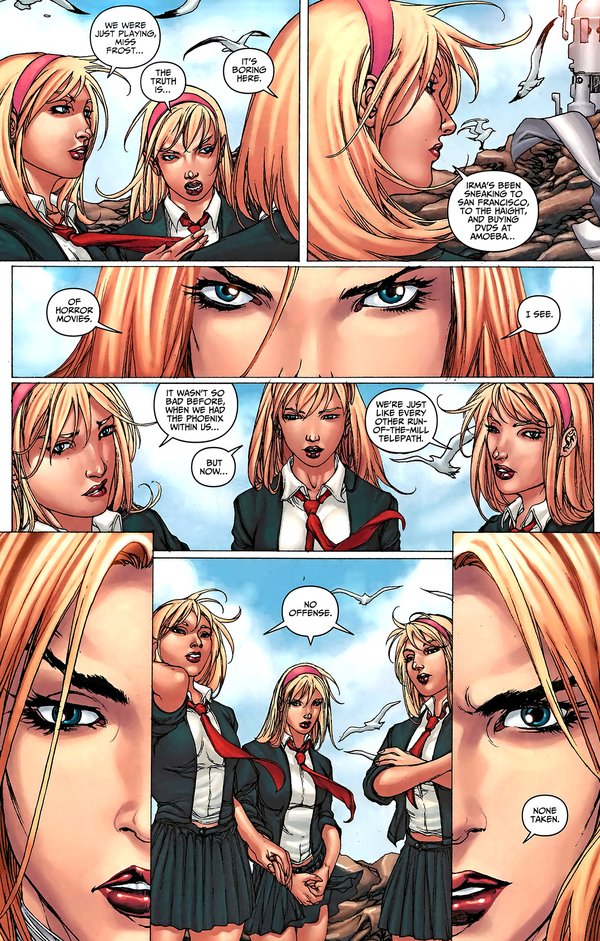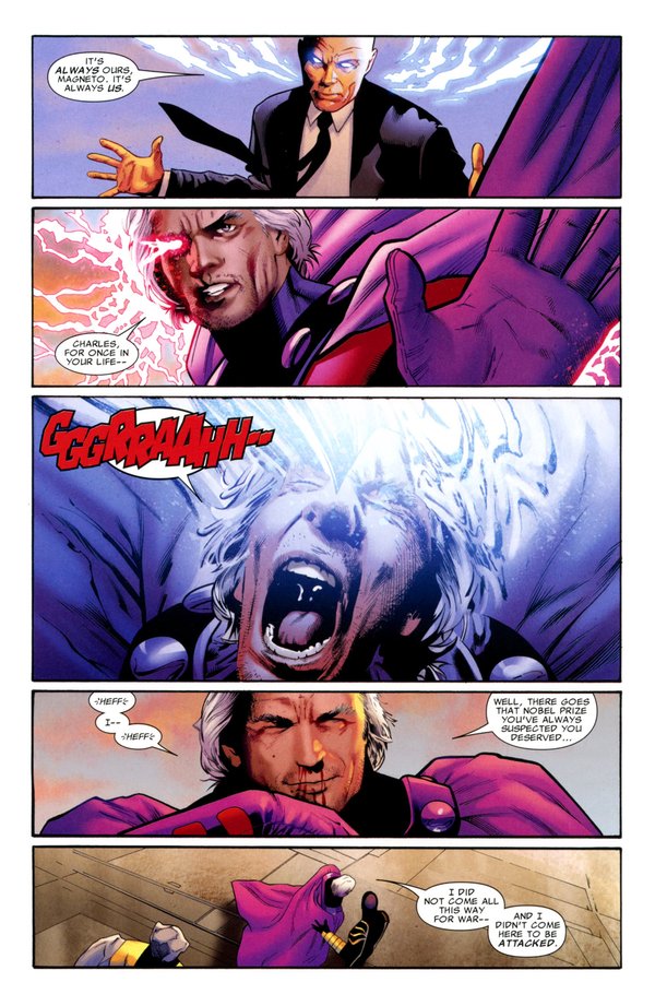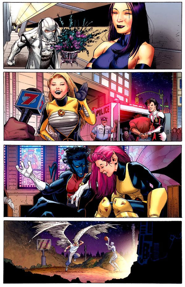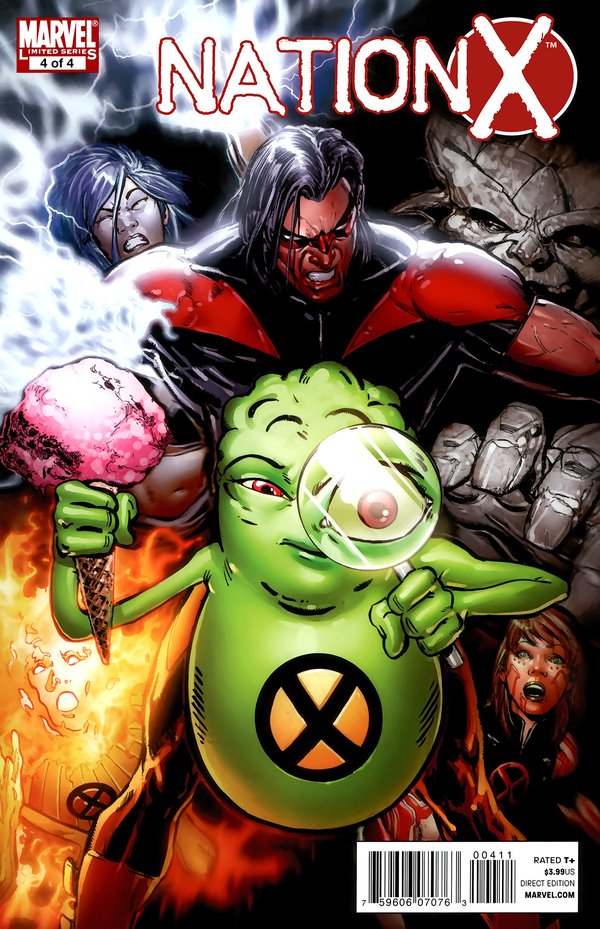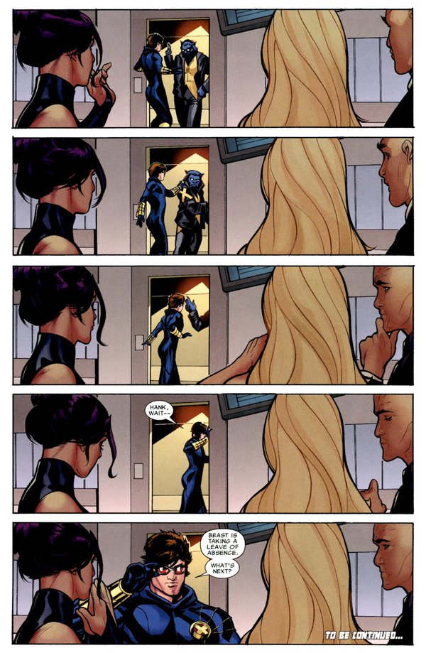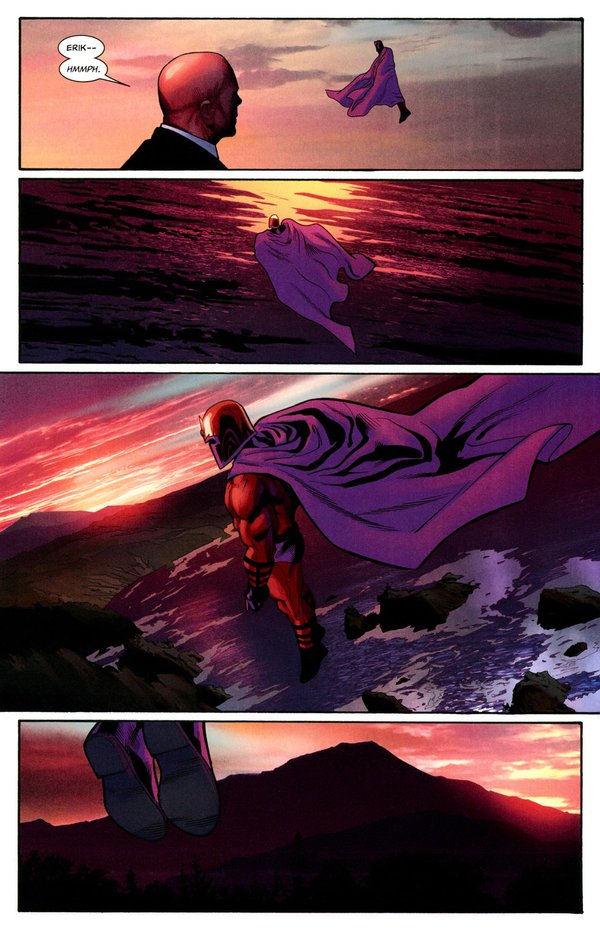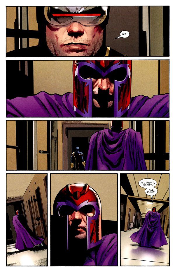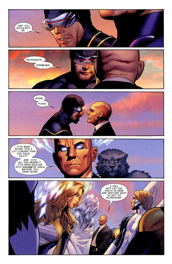Nation X终于结束了,不同于之前事件的结束,Nation X的结束采用了电影般的分镜手法,其中最令人雀跃的,莫过于老万的漂白成功,Kitty的回归,以及AOA中老万与罗煞的恋情终于烧到616来,然而,真正让我感到震惊的,却是结尾的最后两页,一片欢乐的景象中,年幼的狮王终于登上了他的王座.,相较于众人的欢欣鼓舞,史考特.萨莫斯静静地坐在无人的阴暗角落,脸上没有喜乐,没有自信.亦无偶尔出现在读者面前的轻挑与不成熟,史考特.萨莫斯再也不是X-Men里那个心中独白占了一本漫画的4分之3的小愤青,我们再也无法看透他,自古君王多寂寞:无尽的责任,仿佛他的皇冠.无光的黑夜,如同充满绝望的未来,成为披在他身上的龙袍.是不屈不挠??是沉着擘画??是阴谋算计??我只瞧见朱红如血的目光,却再也分不清:看不着了....