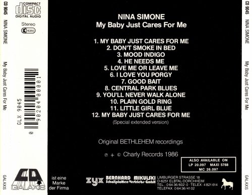 This fine release features Nina Simone's New York, 1957 trio session for Bethlehem with Jimmy Bond on bass, Albert 'Tootie' Heath on drums and Simone accompanying herself on piano. Of the 82 studio sessions and live performances that make up Simone's discography, this date marks her very first recording. To say that her studio debut was a success would be a terrible understatement. At 25-years old, Simone's performance boasted all the passion and ebullience of youth, and all the skill and grace of a seasoned veteran. There are many who consider this session Simone's finest recording. Includes the bonus track 'My Baby Just Cares For Me' (Special Extended Version). Simone recorded the song "My Baby Just Cares For Me" in 1957 for her debut album, Little Girl Blue. The track remained relatively obscure until 1987, when it was used in a UK television commercial for Chanel No. 5 perfume. To follow up this exposure, the track was released as a single by Charly Records, entering the UK Singles Chart on October 31, 1987 (1987-10-31) and becoming, at Number 5, one of Simone's biggest hits almost nineteen years after her previous chart entry. This single also made the top 10 in several European single charts and peaked at number one in the Dutch Top 40. A claymation music video was produced by Aardman Animations and directed by Peter Lord.