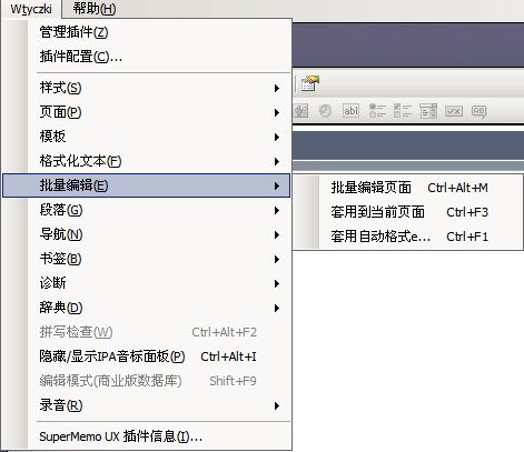 使用方法:解压后,将插件文件夹Plugins复制到安装文件夹下(SuperMemo UX).先运行supermemo ux主程序,再运行pluginsystem.exe.若在"用户"和"帮助"菜单之间出现"wtyczki"的菜单,说明插件系统已开始工作.注意,插件尽量在程序刚启动时加载,若在UX编辑状态下加载,有可能会使程序崩溃.
