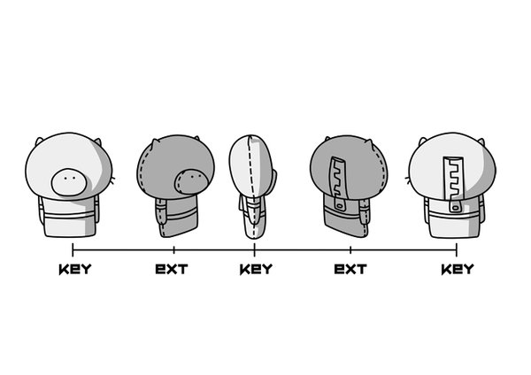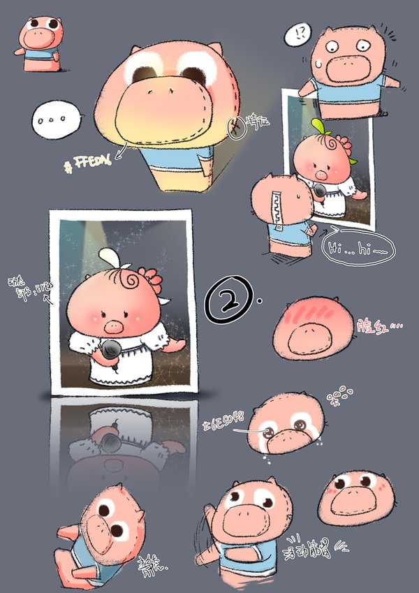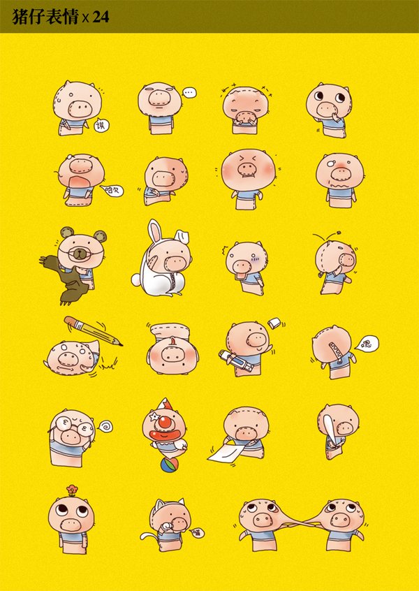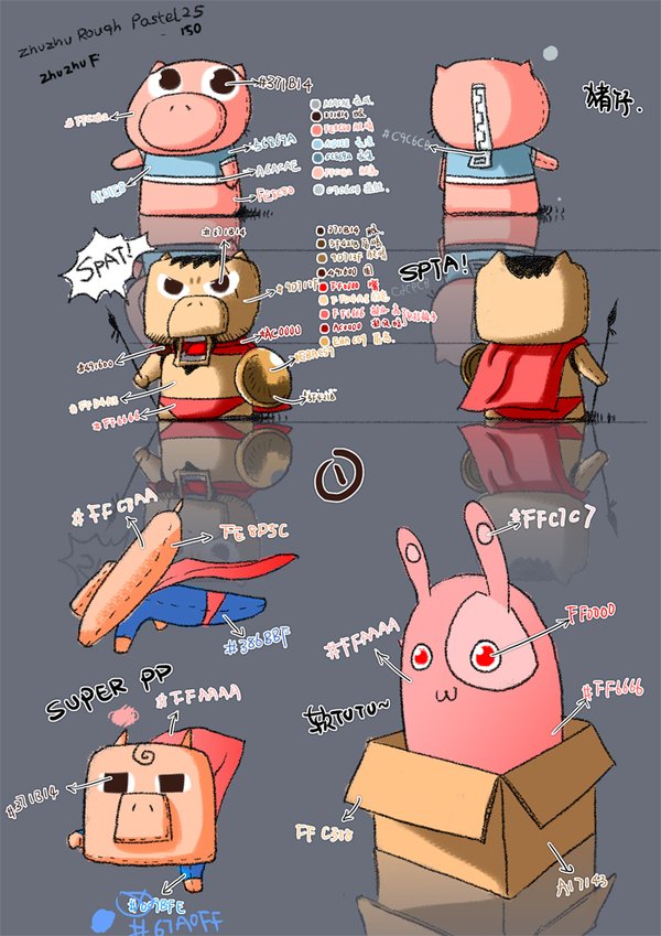由于当初提起笔就只会画猪,于是便有了猪仔这个角色。它是一只玩具猪,后脑有拉链,走动时就可以甩啊甩的。当初有想过做成表情,但是我不想总是一提笔就画猪的状况,需要点突破,所以这部片子结束后我基本没有画过猪的角色。 以下是最初的2张“猪设”图: