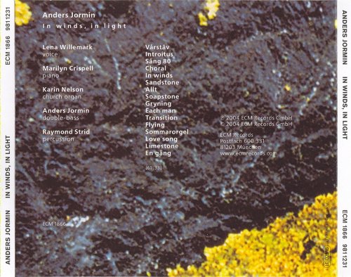 Anders Jormin has been a vital contributor to music on ECM over the last fifteen years, a powerful presence on recordings by Charles Lloyd , Don Cherry, Bobo Stenson, Tomasz Stanko and Jon Balke. "In winds, in light" turns the spotlight on Jormin as composer-arranger. Written in response to a commission to compose new sacred music, and setting exceptional poetry for Lena Willemark to sing, the musical concept expanded as Anders' unique quintet toured it through Sweden. Subsequently, the album was recorded in the large and resonant Organ Hall of the Gothenburg Music Academy.