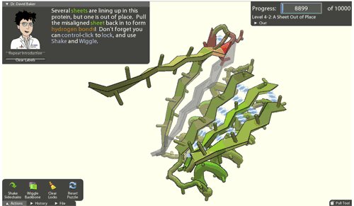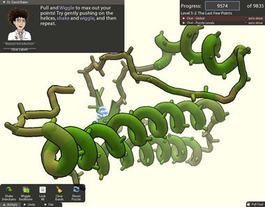 而阿瑞思泰德斯摆弄的那个3维结构就是通过电脑所呈现的真实蛋白, 比如胶原蛋白分子。不需要知道分子生物学最基本的知识,他一样能够帮助解决现代科学里最棘手的难题之一。这个游戏的发明者,西雅图华盛顿大学的戴维•贝克(David Baker)说道:“在无数多种可能的情况下,要用计算机准确预知一个长蛋白质链是如何用最简洁紧凑的方式折迭,是一个相当困难的问题。