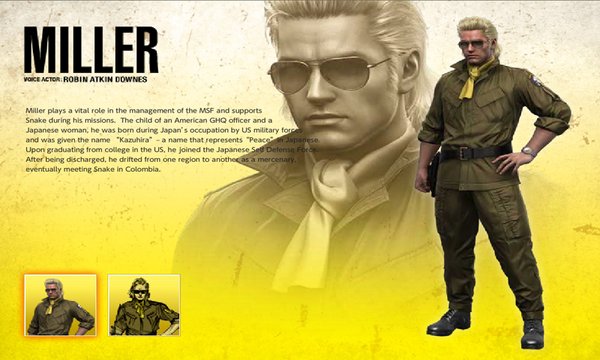 4.米勒(Miller): 配音:杉田智和; 简介:米勒在MSF中担任重要的管理角色,在任务中支援斯内克。他是美国总司令部官员和一个日本女人的儿子。当美国部队占领日本时在日本出生,他的日语名字的意思也是“和平”之意。后来米勒在美国的一所大学毕业,加入了日本自卫队,兵役结束后,以雇佣兵的身份在各个国家间辗转,最终在哥伦比亚遇到了斯内克。