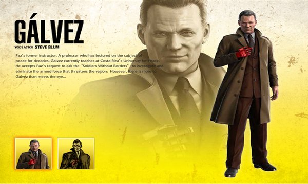 2.贾尔维兹(Galvez): 配音:大塚芳忠; 简介:雨夜,哥斯达黎加的资深学者和热爱和平的女孩来到哥伦比亚请求斯内克的援助。就是这位右手是红色金属义手的中年男人,他是帕兹的前领导师,在哥斯达黎加的一所和平大学中讲授近代和平相关的课程。在帕兹的请求下一同到MSF请援兵清除哥斯达黎加境内的威胁。但是,这个男人身上还隐藏着更多的秘密……