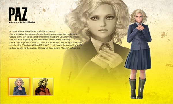 3.帕兹(Paz): 配音:水树奈奈; 简介:来自哥斯达黎加的年轻女孩,珍爱和平,曾跟随贾尔维兹在并未获得认可的多国联合大学学习国家之间的《和平宪法》。他在哥斯达黎加被神秘的武装力量劫持,逃脱之后和贾尔维兹一同来到MSF的总部为自己的国家请求救援。她的名字“Paz”在西班牙语中的意思是“和平”。