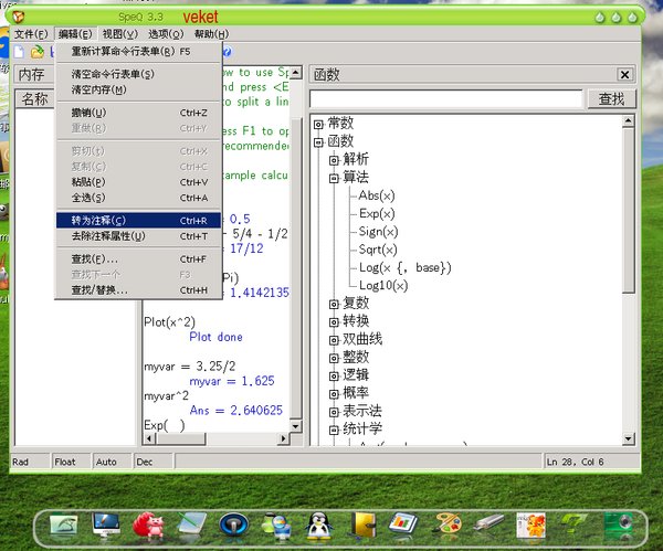 软件类型:计算软件 操作系统:veket 应用平台:veket全系列 网站链接:www.speqmath.com   SpeQ Mathematics 可以计算任意定义变量、计算机复杂的数学公式、绘图。   简介:SpeQ Mathematics 可以计算任意定义变量、计算机复杂的数学公式、绘图。 而算数学最需要的就是一个好的数学工具 引用: SpeQ Mathematics 就是一套非常强大的数学软体 它支援的东西可多了 超级基本的基础运算不谈 它还支援了一堆数学函式(像是 Sin、Cos) 转换数字进位(十进位、二进位、八进位、十六进位互转)也难不倒它 自动计算单位(如: 8 m/s + 36 km/h = 18m/s )也行 如果你要做些几何运算(像是计算圆柱体积或球面积之类)当然OK 而那些想要算一些奇奇怪怪的东西的人 它还可以自订变数名称或是函式定义 欧对了 它还可以画出函数的图表~ Simple mathematics application with an intuitive and easy to use interface. It can handle all kinds of scientific calculations. You can define variables and functions, and plot graphs of your functions. All calculations are performed in a sheet. In there you can freely add, edit and execute all calculations.The sheet can be saved for use at a later time. A math program that is small and runs on every computer.Runs also from an USB-key or floppy disk. SpeQ is an usefull tool for simple, brief calculations as well as working out sheets with extensive variable definitions, functions and complex calculations. SpeQ can be used by engineers, students and pupils or simply as replacement of the Windows Calculator. Here are some key features of "SpeQ Mathematics": · Expression calculations with arithmetic, conditional, logical and bitwise operators · Around 100 built-in mathematical, physical and conditional constants · Around 60 built-in functions for Analysis, Arithmetic, Complex numbers, Hyperbolic, Integers, Probability, Numeral systems, Statistics, Trigonometry · Define your own variables and functions for use in calculations · Plot fully adaptable graphs, trace the plotted functions, save your graphs · Extensive support for units · Decimal, binary, hexadecimal and octal numeral systems · Calculations with lists · Complex number calculations · Colored workarea · Save and load sheets · Orderly overview of all available functions and constants in the Functionstree · A list with all defined variables and functions in the Memorylist [安装测试] ★已经过安装测试,测试系统为veket-2.39。 杀毒提示: 已通过安全检测. 安全检测软件:avast antivirus1.30