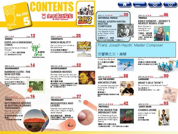 本资源,是《空中英语教室》2010年5月份的配套朗读版光碟。 本资源的发布,仅供测试网络速度,请购买正版图书和光碟。谢谢 =========================================== EVENTS(1) 二~一~年上海世博会 EXPO 2010 SHANGHAI CHINA 来上海探索城市的未来吧 Explore the future of cities in Shanghai 2010.05.01~2010.05.01 ENVIRONMENT(1) 你可以把竹子穿在身上 BAMBOO CLOTH – THE NEW COTTON 这种美妙的植物如今被用来制作衣服喔! This amazing plant is now being made into clothes! 2010.05.03~2010.05.03 TRAVEL (2) 到澳洲的神秘巨石堆探险 MYSTERIOUS MOUND IN AUSTRALIA DRAWS THOUSANDS 一探乌鲁鲁的神祕与奇观 Discover the mystery and wonder of Uluru 2010.05.04~2010.05.04 VIEWPOINTS (1) 你活在哪个现实里? WHICH REALITY? 你有可能同时存在於两个世界中吗? Can you live in two worlds at the same time? 2010.05.05~2010.05.05 ENTERTAINMENT(2) 夏日电影快报 SUMMER MOVIES 备受喜爱的史瑞克和玩具总动员系列电影只是即将登上大银幕的少数几部片而已喔,其他还有更多强片 Favorites Shrek and Toy Story are just a few of the movies coming to the big screen 2010.05.06~2010.05.06 TECHNOLOGY(1) 新的灭蚊利器:雷射枪 MOSQUITOES AND LASERS 科学家正实验用一种新型武器来对抗疟疾这种致命性疾病 Scientists are experimenting with a new weapon to fight a deadly disease 2010.05.07~2010.05.07 HISTORICAL PEOPLE(2) 交响乐之父:海顿 FRANZ JOSEPH HAYDN : MASTER COMPOSER 奥地利作曲家海顿被誉为「交响乐之父」 The Austrian composer who became known as the“Father of the ymphony” 2010.05.08~2010.05.08 SPORTS(1) 古人也疯狂的运动:足球 SOCCER – THE WORLD’S GAME 深入了解这种全世界最受喜爱的运动 Learn more about the world’s favorite sport 2010.05.10~2010.05.10 ASK THE EXPERT (2) 建筑达人 ARCHITECTURE 听建筑师娓娓道来建筑设计的重要性 An architect discusses the importance of design in buildings 2010.05.11~2010.05.11 FESTIVALS(3) 体验午夜太阳的滋味 FUN UNDER THE MIDNIGHT SUN 在俄罗斯圣彼得堡,人们不惜熬夜参加永昼节 In St. Petersburg, Russia, people are losing sleep to attend the White Nights 2010.05.12~2010.05.12 PEOPLE(1) 艾蜜莉‧奥斯蒙──迪士尼新秀 EMILY OSMENT – DISNEY’S NEWEST RISING STAR 艾蜜莉‧奥斯蒙打响了自己的名号 Emily Osment is making her own name famous 2010.05.13~2010.05.13 EDUCATION(1) 挑选MBA学程的诀窍 CHOOSING AN MBA PROGRAM 学习如何挑选适合自己的学程 Learn how to choose the right program 2010.05.14~2010.05.14 LANGUAGE(2) Nym知多少? WHAT’S IN A “NYM”? 你知道有哪些字含有「nym」吗? Do you know words that are “nyms”? 2010.05.15~2010.05.15 LUKE'S BLOG(1) COMING HOME 路克準备返家囉 Luke is ready to head back home 2010.05.17~2010.05.17 ===========================================   《空中英语教室》为月刊,杂志当前主要以收录世界最新时尚资讯、热点话题、人物、故事、文化、社会现象等为主。由于该杂志并非专业学术杂志,且课文难度适中,因此对于所关注问题的讨论并不十分深入,仅以令人了解为主。有人也反映杂志的内容连续性和系统性不强。杂志中课文部分按照当月日期有课文编号,除星期日外每天都有课文,电视节目与广播节目也是同样。每篇课文均标有难易程度标示(Low, Medium或High),并配有"Talk About It" "Key Points" "Word Bank"等栏目。在杂志末尾配有一份英语练习题。此外,还有关于写作和语法等内容的出现。