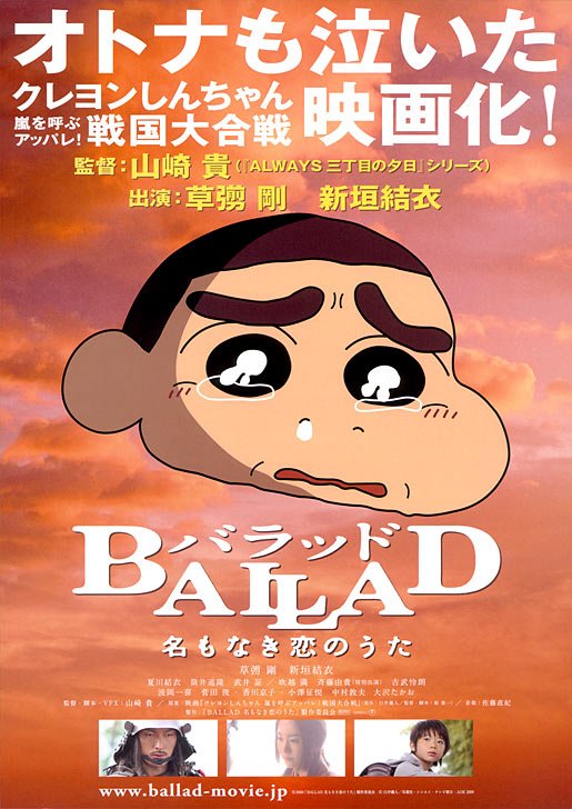 2002年有一誓部电江影给整个日本电影界带来了冲击,那就是蜡笔小新的第十部剧场版《呼风唤雨!战国大合战》。在人们的印象中,蜡笔小新是个色色的搞怪小男孩,关于他的故事总是笑料百出令人捧腹。然而这部电影却出乎意料的大赚眼泪,引得男女老少、甚至从来不看这类动画的观众都跑去电影院抹眼泪。影片票房收入达13亿日元,成为当年的一大话题。同时,电影不仅在民间口碑极佳,而且还获得了国家的褒奖,成为2002年度文化厅媒体艺术节动画部门大奖的得主,这是蜡笔小新系列电影首次赢得这样的荣誉。除此之外,影片还摘得了每日电影大赛动画电影奖、互联网电影大奖最佳日本电影等多项桂冠。