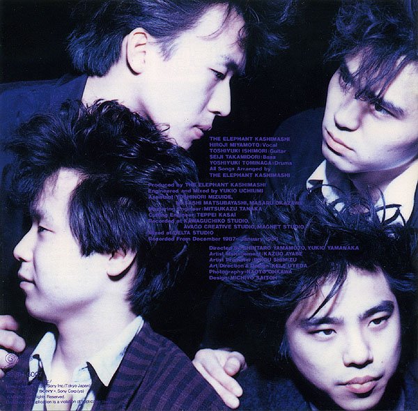 Elephant Kahsimashi,大约可以译成"大象狂暴"。乐队名称中"Kashimashi"这个词,据称来自于昭和时代的一个女子漫才三人团"かしまし娘"(Kashimashi musume)。Elephant Kahsimashi成立时间非常早,1981年,当时还是高中生的宫本、石森和富永就已经玩起了乐队,第二年就开始登台演出。1986年,高绿成治正式加入乐队,Elephant Kahsimashi从此正式成型。同年在CBS SONY唱片公司下属的"双启舍"事务所取得一纸唱片合同。