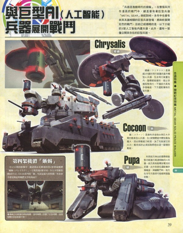 兵器是推动时代的齿轮,在整个系列作漫长的战斗中,总是会有着巨型兵器于斯内克对峙。本作中也会有与其系谱相关的巨型兵器登场,将与斯内克展开壮烈的战斗。目前已经揭晓的是,以下介绍的3架人工智能内建兵器。此外,还有一架仅公开其存在的巨型兵器。