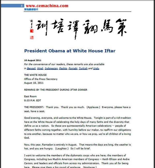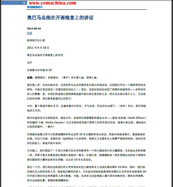 依据语种、训练用途和选题性质等的不同,《欧盟口译训练》分为很多类别。其中,A6系列的选题偏重于各国官方文件,包括各国元首致辞,公众演讲,外交公报,声明等等,比较正式,关注的区域则偏重于美洲和亚太地区的经济政治动向。题材的难易程度属于中等水平,没有大家想象地那么高深莫测,基本上,如果你的英语水平能够适应《慢速美国之音》的话,就可以用本系列的材料来练习英语口译。 请使用Adobe Reader 9.0以上版本阅读。使用过低的版本,可能会遇到无法打开PDF文档等情况。 文件是设置为禁止修改的,但是可以自由下载,浏览,高精度打印。我知道有个别同学有着强烈的探秘情节,但是既然已经可以自由浏览,高精度打印了,我想,这真是夫复何求了吧?…… 更新周期: 我尽量保持每周更新3-5篇的速度,若是我去海外出差的话,可能就会暂停一周左右的时间。请心急的同学不要总是发短信来催我。对于大家的谅解,我先谢谢大家了! 作者介绍: