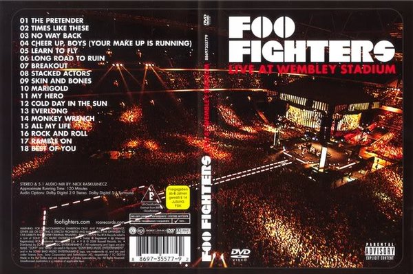 Foo Fighters将2008年6月6和7号,两天共16万5千张门票全数售罄的英国伦敦温布利体育场Wembley Arena演唱会实况,精选剪辑推出《Live At Wembley Stadium》影音DVD,两小时的热力演出,让Foo Fighters带来的独特舞台魅力与惊人爆发力,震撼你的视觉与听觉,登上英国DVD榜冠军,澳洲仅花三个礼拜即获金唱片销售认证。以入选滚石杂誌「2007年百大优歌」第47名、入围葛莱美「最佳摇滚歌曲」、「最佳唱片」的〈The Pretender〉当开场,Dave指示粉丝一段跟唱后,随即引领Foo Fighters最拿手的摇滚猛劲;舞台前延伸一条通道,让疯狂的Dave衝来跑去,更不时的狂飆吉他,朗朗上口的〈Learn To Fly〉响起,按耐不住乐迷的高涨情绪,陷入沸腾不已的超High场景;〈Breakout〉再一次的让台下沦陷,到了〈Stacked Actors〉更是变本加厉的狂吹Solo。中场休息交给鼓手於原地不断旋转的舞台上表演个人秀,2007年开始随团登台演出的美艳女小提琴手Jessy Greene,在Dave引荐团员时互飆一段;〈Cold Day In The Sun〉则交付鼓手Taylor Hawkins担任主唱;接连〈Everlong〉、〈Monkey Wrench〉到〈All My Life〉三连发,鞭打著直衝脑门快意的庞克音浪,令人听得血脉喷张。重头安可戏则是请到摇滚祖师团队Led Zeppelin吉他手Jimmy Page和贝斯手John Paul Jones现身助阵,Dave转负责鼓手一职,Taylor拾起麦克风献唱Led Zeppelin的〈Rock And Roll〉,随后Dave主导〈Ramble On〉经典杰作,足以让人感动到全身起鸡皮疙瘩,最终用〈Best Of You〉最为完美谢幕,铁汉Dave更是数度哽咽落泪,无论你是新或旧的摇滚客,绝对不能错过这场世纪绝讚大秀!