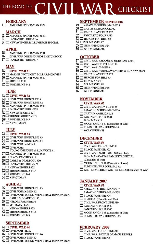 MARVEL的年度大事件,包括X-MEN、AVENGERS、F4、SPIDER-MAN以及其他众多人物都将参与的漫画,就是CIVIL WAR(超级英雄内战)了。据MARVEL的官方说法,这将是一场“英雄对英雄”的战争,双方都有自己的理由、自己的正义,没有哪方是邪恶的。
