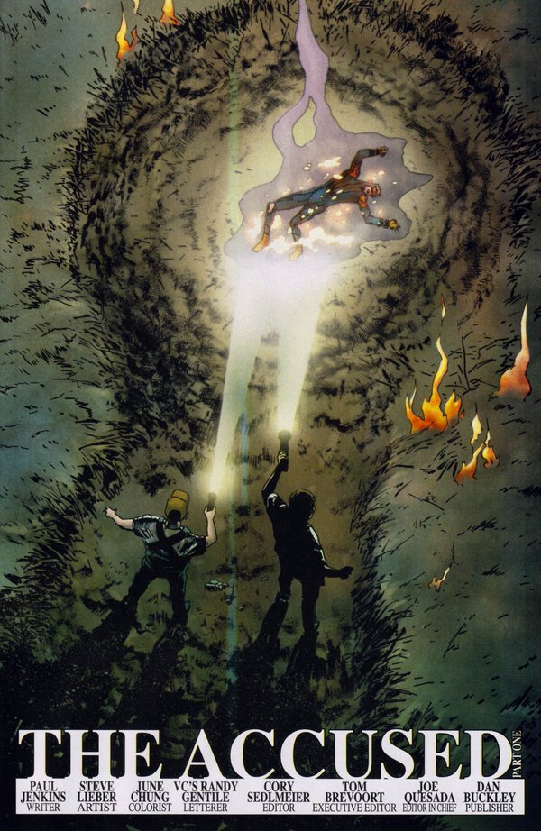 CIVIL WAR #1 由年轻英雄们组成的NEW WARIORS,为了赚钱接了个电视台的差事,他们抓捕歹徒的战斗将被拍摄下来并在电视台播出。但是这一次,事情出错了,他们追捕的人中有Nitro,他并非是那些三流反派可比。追捕中,Nitro爆炸(他的能力就是发动爆炸),摧毁了一座小镇,杀了600余人,其中包括几十个孩子。而所有这些都被电视台记录下来并播出。于是舆论大哗,群众中走上街头抗议蒙面英雄,认为这些英雄实际上是在胡作非为。美国政府趁机推出了“超级英雄注册计划”,要求所有有超能力的人到政府注册,成为政府雇员,为政府服务。不注册者即违法,将被特殊部队狩猎拘捕并坐牢。 S.H.I.E.L.D.母舰上,现任总指挥Hill要求Captain America担任英雄猎捕部队的指挥官,但是出乎意料,Captain America拒绝!Hill立刻要求逮捕Cap,Cap打翻了围上来的特殊部队,突围而出,劫夺一架战斗机后逃走。 之后,Iron Man,Mr.Fantastic,Yellow Jacker三人在白宫向总统保证,他们将负责追捕Captain America.