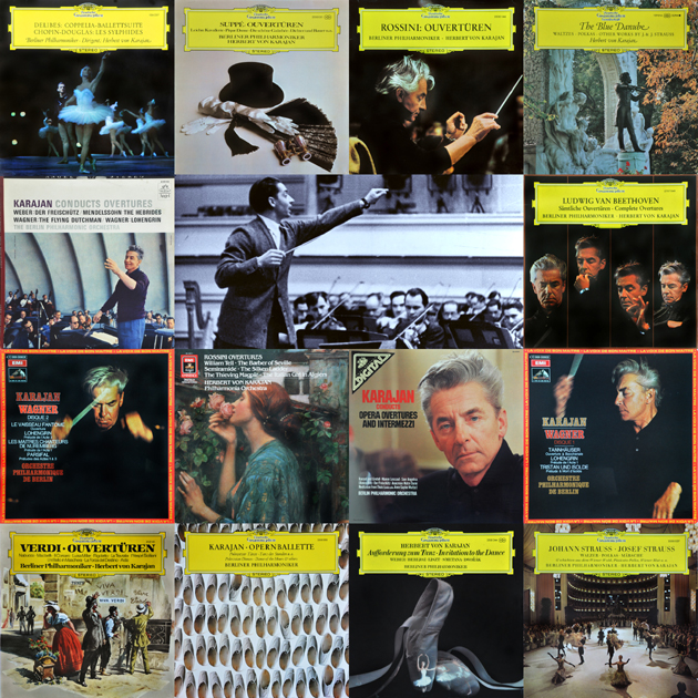 好久没有发帖了。最近不知是何种心情所致,翻出了一些小卡的序曲来听,从瓦格纳听到他的贝多芬,再听罗西尼和老柴,以及威尔地和苏佩,甚至约翰•施特劳斯。我从来不是卡迷,但我知道喜欢卡拉扬的乐友那是浩浩荡荡,尤其是亚洲人。在VeryCD上我知道也已有了好多卡拉扬的帖子,我这里发的有些可能已有相关CD发布,但我相信黑胶的声音还是不一样的。今天就顺着雅兴,从我的收藏中选出如下十几枚黑胶唱片 (CD唱片不在选择范围之内),和大家一起来分享一下。这些序曲前奏曲和舞曲相对而言都比较通俗,特别对于一些古典音乐初入门的乐友想必更为适合。但是黑胶唱片不同于CD,因年代及使用和保存等各种因素或多或少会在唱片播放时有些炒豆声甚至有爆音跳槽,这种状况尤其会发生在唱片每一面的开始部分 (但有时全新开包的唱片也会有炒豆声),听惯了黑胶唱片或对黑胶已有些许认识的乐友不会感到意外,像我这种已有了黑胶癖的听到沙沙声心里更舒坦,但如果是只习惯于听CD或电脑文件音乐的朋友,假如您的耳朵不能忍受请万万不必勉强。