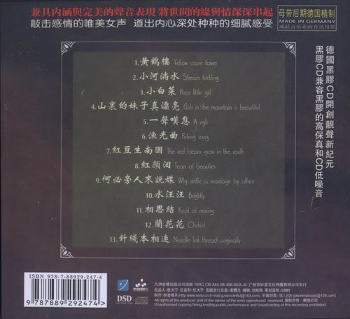 去年中央电视台主办的中秋晚会,童丽以一曲“明月几时有”亮相,带给观众一份惊喜。 妙音公司出品的这张LP-CD黑胶唱片,母带后期德国精制,妙音的高水准加上童丽的精妙演唱,奉献给HiFi爱好者一张珍贵藏品。 作为一名发烧友最熟悉的发烧女声,童丽金子般的声音带给乐迷无比的享受,深受海内外华人朋友喜欢。如今这张中国略带古典诗词风的专辑,那古朴典雅的旋律,略带淡淡的愁绪,童丽的演绎投入自然、情意真切,唱出了人人共有之“思”情,与词曲场景契合得天衣无缝。 兼具内涵与完美的声音表现,将世间的缘与情深深串起,敲击感情的唯美女声,道出内心深处种种的细腻感受。 清纯美感的歌喉,不经意流露出东方女性妩媚、性感和生命活力,录音采用少有的顶级电子管麦克风制作该唱片,女声与伴奏乐器的音色听来有如丝绒般光润甜美,特别是在够级别的音响上更能体会到柔和延展的超高频。