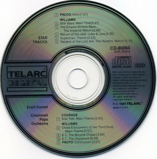 : 01. Introduction 02. Main Title from Star Wars 03. The Imperial March from Star Wars: The Empire Strikes Back 04. Luke & Leia from Star Wars: Return of the Jedi 05. Theme from Superman 06. The Raiders' March from Raiders of the Lost Ark 07. Main Theme from Star Trek (Original TV Series) 08. Main Theme from Close Encounters of the Third Kind 09. Bicycle Chase from E.T. the Extra-Terrestrial 10. The Departure from E.T. the Extra-Terrestrial 11. Conclusion