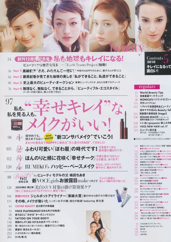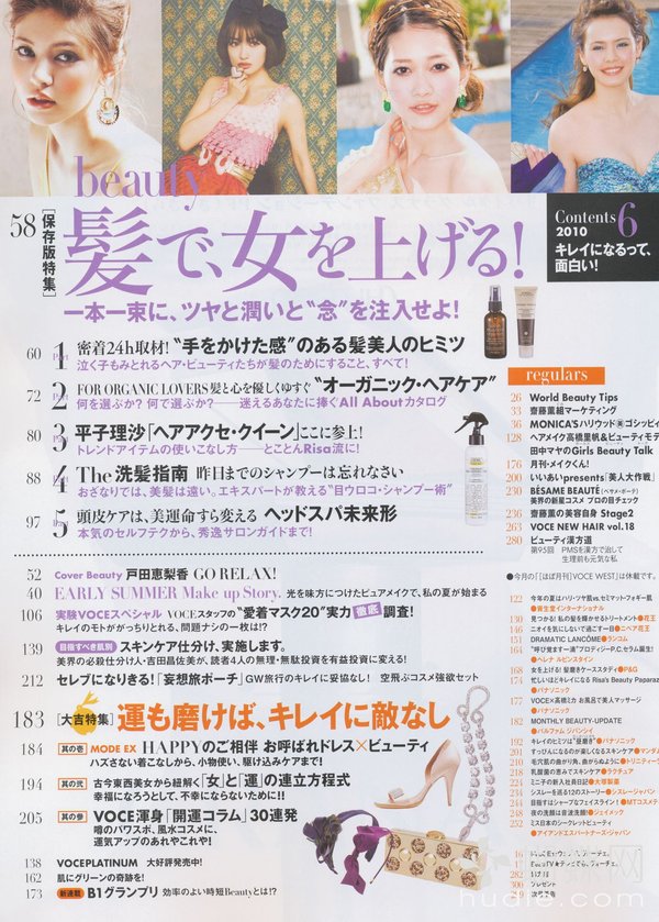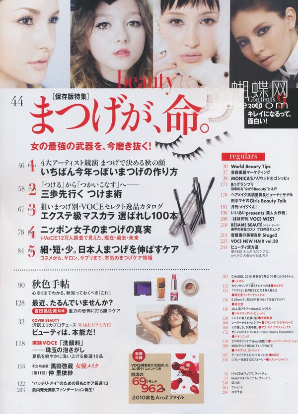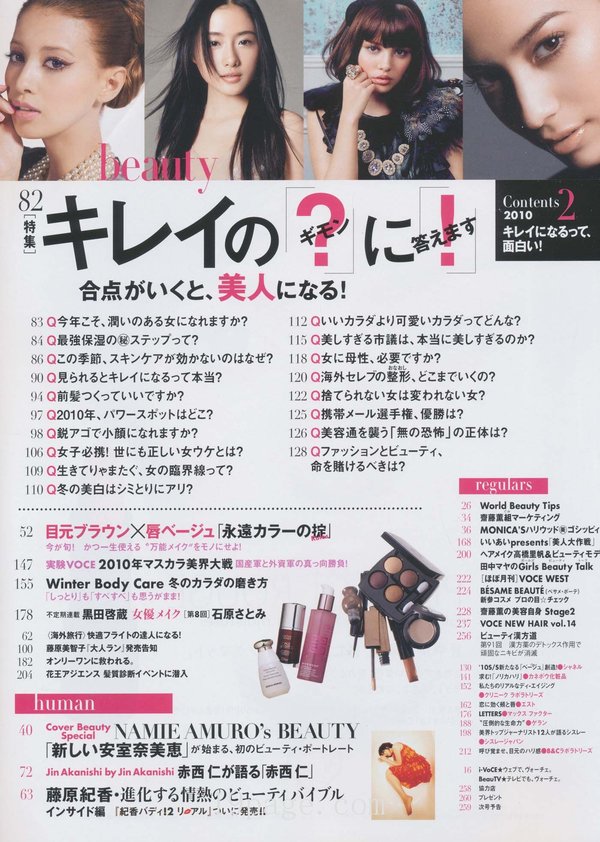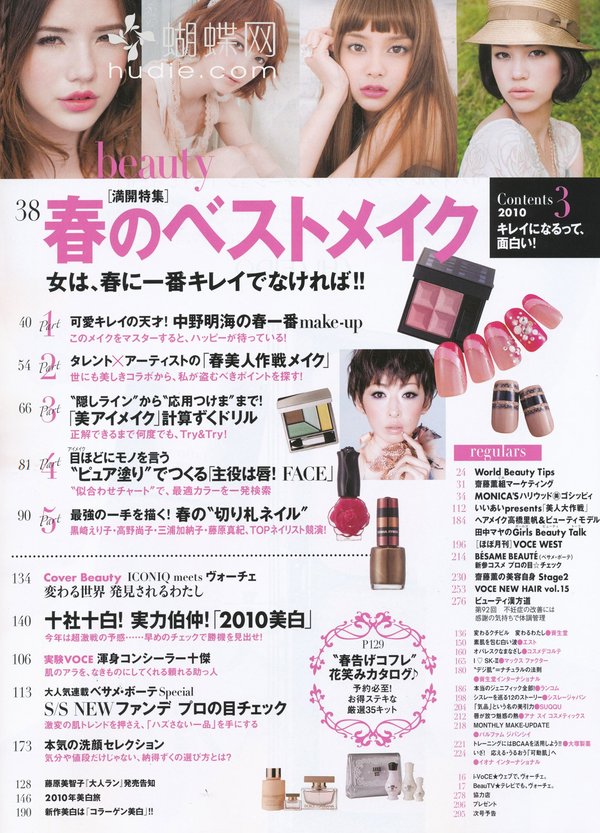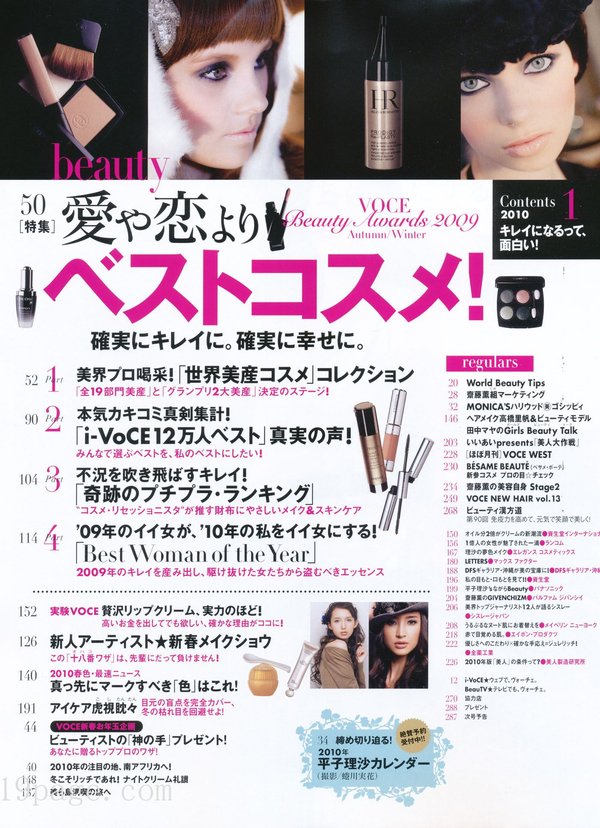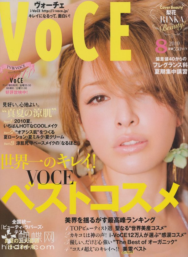 想知道变换季节时应该使用什么样的保养品才能让肌肤水嫩水嫩吗?又有哪些新上市的名牌彩妆成功地打造女人魅力呢?以女性杂志为主的日本讲谈社出版的《VoCE》,是以「美容」为主轴,替20~25岁的女性朋友们收集最流行的彩妆技巧、以及最完整快速的美容资讯的一本人气杂志。不单单是让爱「面子」的您越来越美丽,让读者们能够享受成为美人的乐趣,更是本志追求的目标之一。 换季或节庆时的所推出的限量彩妆,是许多时尚女性趋之若鹜的明星商品,因此《VoCE》会不定时推出新鲜内容,替读者们提供最新的各牌商品比较与定价,让您能预先获得各类彩妆资讯,成为时尚小天后!此外,更多精采美容小秘诀,也都不会让您错过!像是如何除去恼人的青春痘、完美除毛术、丰胸、减肥、消除疲劳又兼具美容效果的神奇泡澡药方……等各种偏方或秘诀,都是《VoCE》杂志的编辑部和读者共同交换情报与使用过后的心得分享喔! 拥有最适合自己的化妆、保养品之后,流行的彩妆资讯,如何搭配发色或服装,也是不能漏掉的重点;像是最基本的粉底及彩妆,再深入介绍一些适合上班的正式妆扮,或参加PARTY的炫魅妆,还有配合季节做搭配的彩妆,如夏天应该使用亮丽的眼影、冬天则可以选择颜色较深的紫色或咖啡色;……。这些精采又实用的内容,都会透过模特儿的示范与教学,让您轻松成为人人称羡的美丽俏佳人! 另外还有指甲彩绘、美白秘方、大明星保养术等精采内容,以及非常受欢迎的占卜连载单元《怒涛星座》(怒涛的星座占卜),让您在成为美人的过程中,也能享受更多不同的乐趣!想要散发自信光彩、成为一个美容高手吗?翻开《VoCE》,您会发现不同於以往的自己喔!