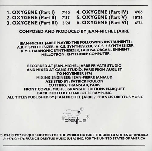 1976 年发行的专辑“Oxygene”,为法国电子音乐奇才 Jean Michel Jarre 的首张成名作品,甫推出即获得国际乐坛的肯定;其独特的个人诠释风格,塑造当时电子合成音乐的历史转折点,为此,美国的《大众》杂志推举 Jarre 为年度风云人物,而英国的《每日镜报》更评为“a French revolution to rock the world”,足证其所引起的真感性音乐新潮流。