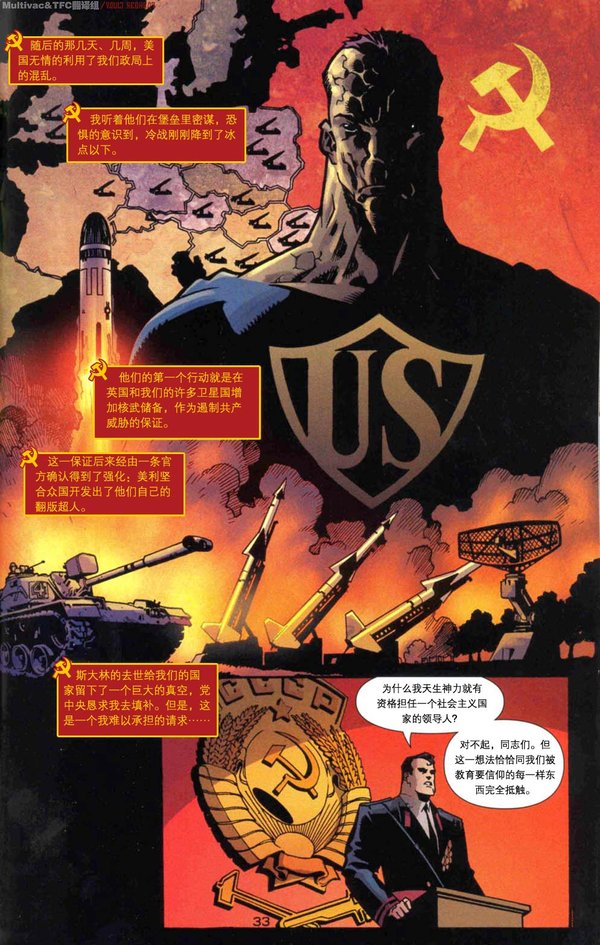 “当超人刚刚接掌权力的时候,苏联只是一个脆弱的联合体。二十年之后,全世界都是我们的盟友。只有美国和智利选择保持独立。它们是世界上最后两块资本主义阵地,而且都处于经济和社会崩溃的边缘。世界上其余的国家高高兴兴地,自愿将全权控制交给超人,敬畏的看着他重建他们的社会,比任何人类都有效地处理他们的事务。贫困、疾病和无知都已从华约国家实际根除……对党的不服从也已被切实清除。”