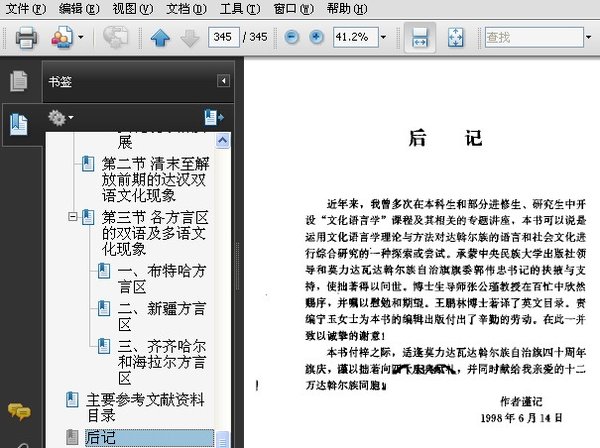通过语言研究社会、文化,在我国有着悠久的传统,远至《尔雅》、《释名》,近至清代训诂学的著作,皆为通过语言考证古代名物制度作了大量的工作。但从现代科学观点和方法来研究语言和文化的,恐怕要首推罗常培先生于1950年出版的《语言与文化》一书。罗先生应用中外古今大小民族语言的材料,从语源、造词心理、借词、地名、人名和亲属称谓六个方面,来研究文化遗迹、文化接触及族源、民族迁徙和婚姻制度等社会、文化问题,开我国语言与文化研究之先河,成了我国当代文化语言学的第一部开山之作。事隔30年之后,在我国掀起了文化语言学新浪潮,各方学者纷纷著书立说,可谓盛况空前,形势喜人。丁石庆副教授从文化的视角集中研究单一一个少数民族的语言,又把文化语言学研究往深处推进了一步。他本人是达斡尔族,熟悉达斡尔语及维吾尔、哈萨克等现代突厥语言,而且,专修语言学专业,大学毕业之后,长期从事语言学教学工作,多次讲授“文化语言学”课程,既有语言学理论功底,又熟悉具体语言材料。在这个基础上写作本书,当是水到渠成的了。本书通过达斡尔族语言探讨达斡尔族婚姻家庭、宗教信仰、人名地名及文化交往,洋洋20余万言,大至天地山河,小至心理观念,得心应手,运作自如。本书材料丰富准确,编排合理清晰,是文化语言学领域中一部精细翔实,独具特色的新著。它的出版,定会受到关心文化语言学的读者的欢迎。