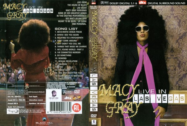 Let the cover of this release be a warning. On the front of Live in Las Vegas, Macy Gray is made to look more like a wax figurine or a Hanna-Barbera creation than herself. Judging from the look on her face, the photo could've been snapped in a hotel lobby by a zealous follower. It's the kind of presentation that should make a lot of her fans wonder what they're getting themselves into. Beyond the location, there's no information provided in the sleeve. A little research divulges that the set took place on March 1, 2003, a few months prior to the release of The Trouble with Being Myself. The track list is fairly balanced between her first three albums, and the songs are often peppered with '70s funk and old school hip-hop references, so the arrangements are rarely identical to what you're used to hearing. It all starts very groggily, with a fake-out intro of "I Try" that abruptly and awkwardly shifts into an instrumental funk freak-out (the kind that normally keeps the crowd occupied while the star is changing costumes or indulging in some water or whatever else is backstage), only to give way to a wobbly "Sex-O-Matic Venus Freak." Gray takes a while to warm up and hit her stride, and even when she's at her best here, she's not delivering a great performance. But what really rankles is that the backing singers are often out of sync, only adding to the sloppiness. Another warning is that this was not released on Gray's label, Epic, but by a DVD vendor that doesn't specialize in this kind of thing. The DVD version does allow you to get the full effect, which would be the smarter option if you must get your Macy fix. At least the images will be there to distract you from the faults of the performance.