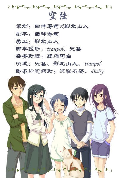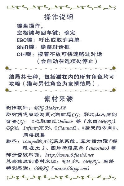”。 ———————————————— 所有角色的立绘均为山人原创,每个人物都有两种姿势与十几种以上的表情,猫则有三种姿势…… 可攻略角色共五个半,三女两男外加一只猫……-v- 无BL,男性角色虽然可以攻略,但与主角的关系完全是单纯的友情,和女性角色的结局其实也与其说是爱情不如说更接近恋爱的萌芽。 结局共七种(其中一个为未攻略任何一名角色时的单身结局),除猫以外不同角色的路线有一半左右的剧情都截然不同。