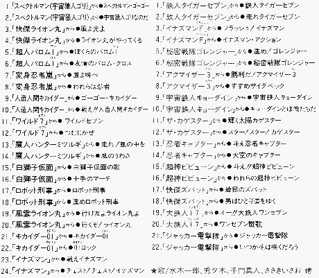 1971年到1977年,作为日本电视特摄片的黄金时期,以石森章太郎等创作的东映特摄英雄形象占据了绝大部分的电视特摄片市场,这套唱片收录了此期间除假面骑士系列外的东映特摄的高人气作品的主题曲和片尾曲。演唱者包括了水木一郎、子門真人、秀夕木、ささきいさお、堀江美都子等。