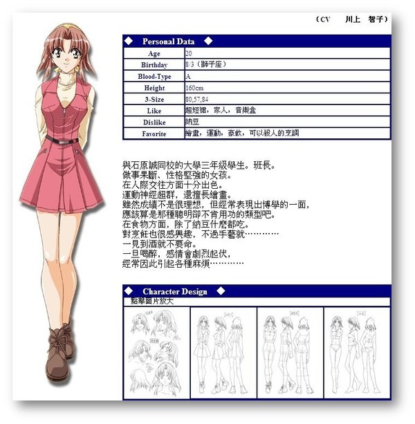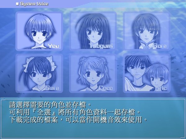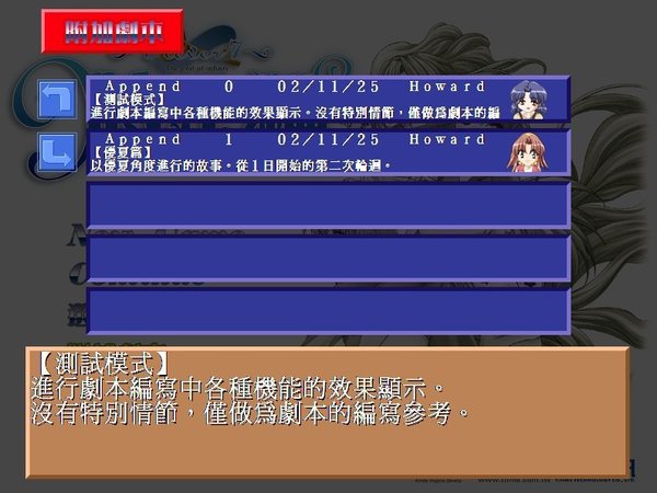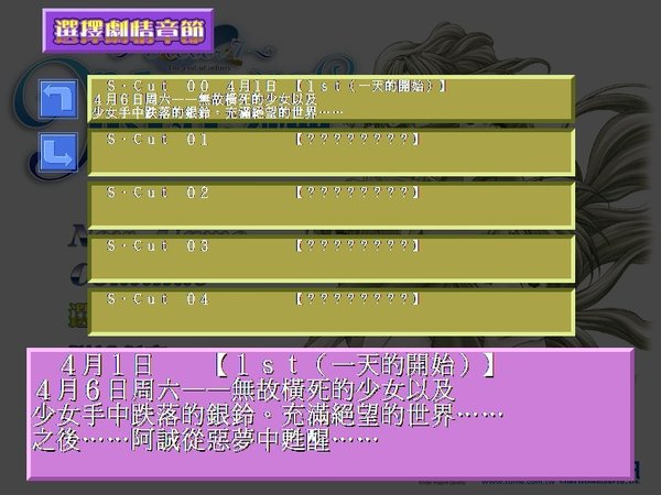 时光之钥 为了加深彼此间的的感情,即将升入大学三年级的研讨会成员们决定举行一次为期一周的集训,时间是4月1日至7日,地点是南方一个小岛的一家小旅馆。集训期间,主人公在和研讨会成员们以及本地的旅店老板娘等人的交流中度过每一天。   但是,可怕的命运在等待着他们。主人公在集训的第一天晚上梦见自己最重要的女性在自己面前死去,而且恶梦在集训最后一天前的4月6日变成现实。更可怕的是,两人的意识跳回4月1日,而且在这六天中反复循环。   两人能够跳出这个时间的死循环吗?另外,这个时间陷阱的真相以及这次集训的真正目的又是什么呢?将由你在游戏中找到答案。