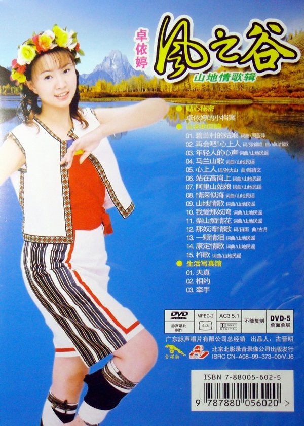 : 精选排行榜最佳台湾山地情歌,百万音效,带给你无与伦比的视听享受。绚丽舞台最佳声光效果。 《风之谷》又称《山之谷》,收录了15首山地情歌,卓依婷以优美的歌声将原住民回荡于山谷间的爱情故事柔情地唱出,本专辑还特意邀请了阿美族专业舞蹈演员全程配合演出,加上依婷那艳丽的阿美族服饰,更丰富了视觉的享受。